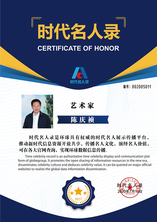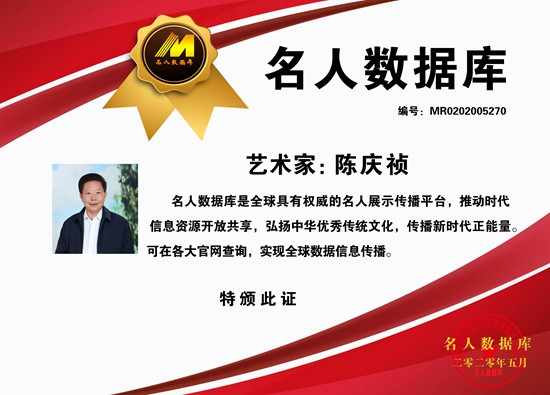 陈庆祯,笔名:齐石。男,汉族,中国共产党党员,大学文化,研究员、客座教授,中国书画院副院长,中国书画家协会常务理事,中国民间书画家协会常务理事,中国书法院副院长,中国老年书画家协会会员,中国香港文联书法家协会会员,中国百强书法家,国家一级书法师,中华海外书法家协会副主席。中国艺术财富人物,中泰、中马友好文化交流大使、荣誉艺术家,湖南卫视《德艺会》签约书法家,录入艺术家名人数据库,书画作品被马来西亚中华联盟与泰国星暹日报社永久收藏。书法作品被《人民网》、《央视网》、《新闻头条》、《手机搜狗网》、《快资讯》《新晨报》等20多家网站、报纸刊登发表。
